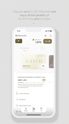 L'application KLUB 11 Membership se révèle être votre passeport privilégié pour explorer et maximiser les avantages de l'écosystème K11. Conçue comme un centre de commande intuitif, elle transforme chaque interaction en une opportunité de récompense. Gérez sans effort votre compte de membre KLUB 11 Membership, où chaque dépense se matérialise en Points KLUB précieux. Suivez votre progression en temps réel et convertissez ces points en K Dollars, une monnaie numérique qui s'utilise comme de l'argent comptant à travers l'ensemble des destinations K11, débloquant un monde de privilèges exclusifs et d'expériences enrichissantes.