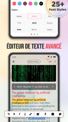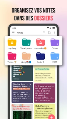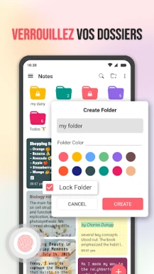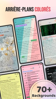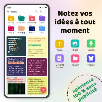 L'organisation devient un jeu d'enfant grâce à des fonctionnalités pensées pour vous. Créez des dossiers personnalisables, identifiables par des couleurs vives, pour ranger vos notes sans effort. Accédez instantanément à vos informations grâce à une recherche performante et marquez vos éléments clés comme favoris. La personnalisation est au cœur de l'expérience : utilisez l'éditeur avancé pour mettre en forme votre texte, intégrez des images ou des fichiers audio, et donnez vie à vos pages avec des fonds variés – couleurs unies, dégradés, motifs ou images. Chaque note avec Notes - Bloc-notes, Carnet de notes peut refléter votre style unique.