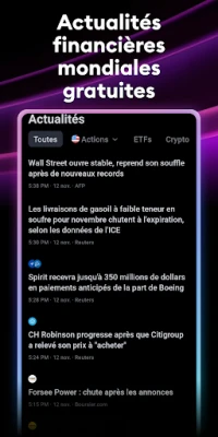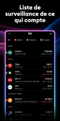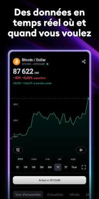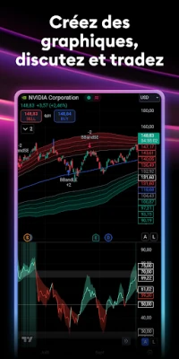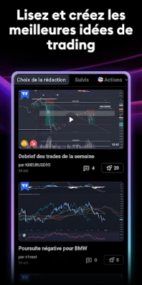 Devenez membre de la communauté mondiale de TradingView, le réseau social le plus dynamique pour les traders et investisseurs. Échangez des idées, partagez des stratégies et enrichissez vos connaissances au contact de millions d'autres passionnés. Profitez d'une fluidité parfaite : toutes vos analyses techniques, vos graphiques enregistrés et vos préférences sont automatiquement synchronisés, vous offrant un accès continu à votre travail depuis n'importe quel appareil. Bénéficiez également d'une couverture mondiale exhaustive, avec des données en temps réel provenant de plus de 50 bourses majeures, incluant des places financières clés telles que le NYSE, le LSE et le NASDAQ, ainsi que les prix comparatifs des principales bourses de cryptomonnaies.